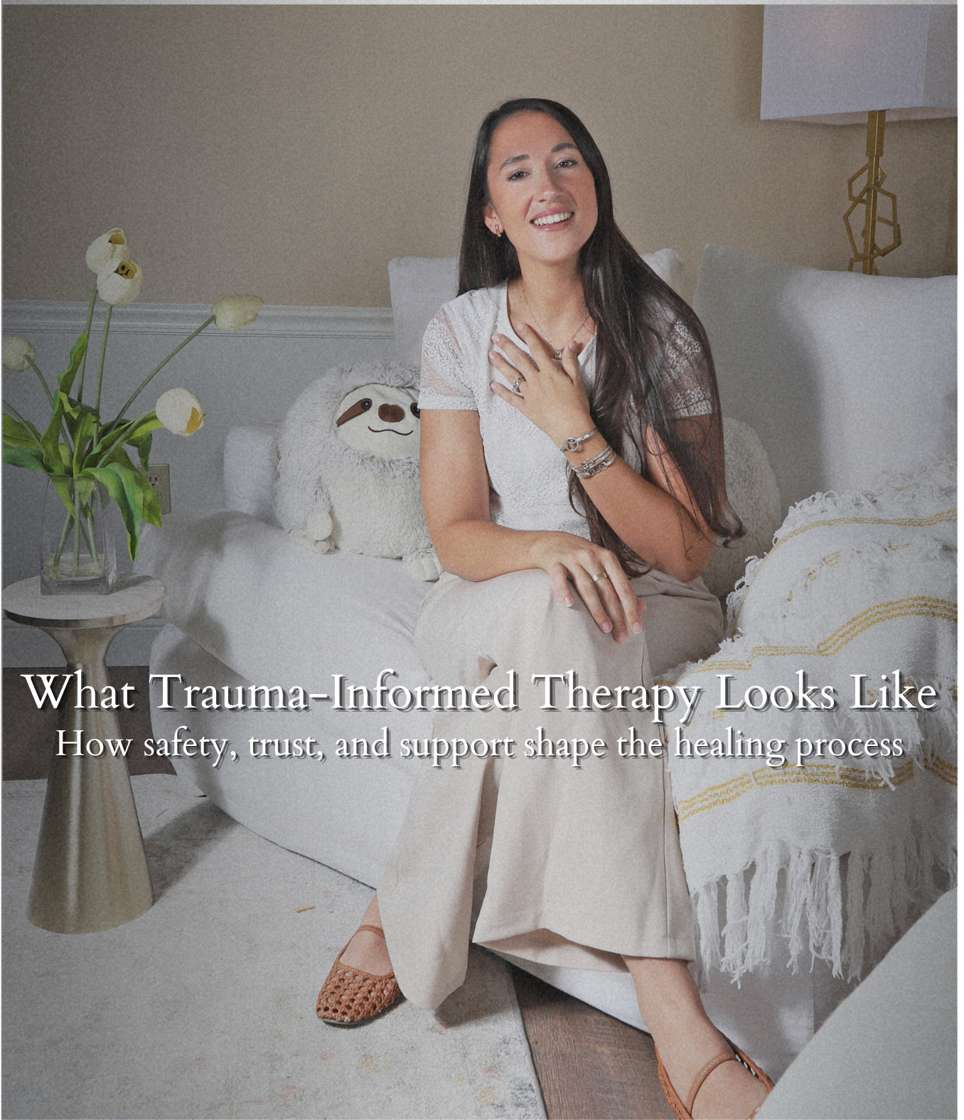 Emily Espinoza, MA, NLC-P, Registered Marriage & Family Therapist Intern seated in a calm counseling office with the title “What Trauma-Informed Therapy Looks Like” and a subtitle about safety, trust, and support in healing.